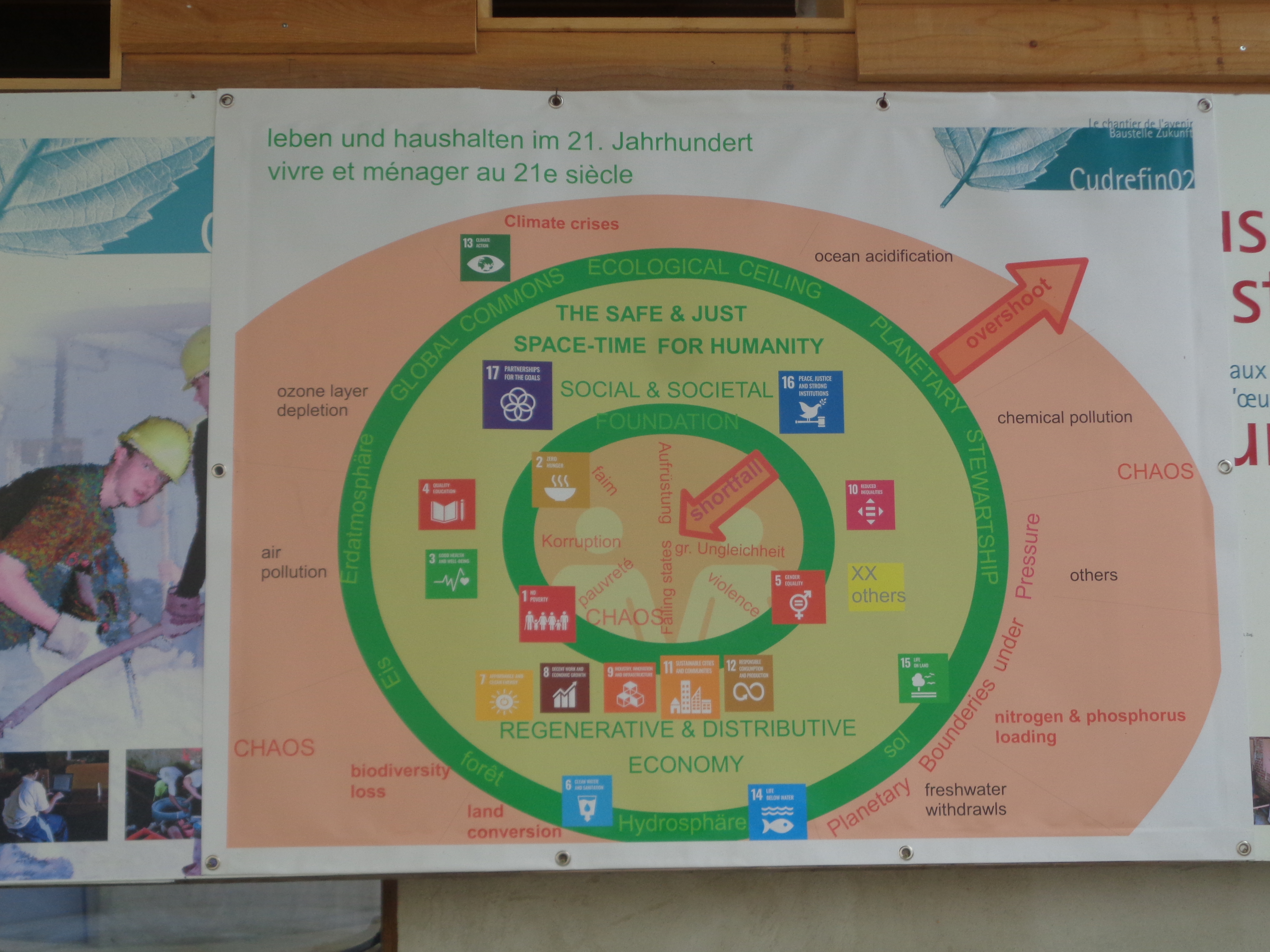 24.7.2020 - Am Zukunftshaus angebracht ist die neue Konzept-Graphik "Nachhaltige Entwicklung NE", die auf der Baustelle und an der PHBern entwickelt worden ist. Sie vereint mehrere aktuelle Konzepte zur NE: die planetarischen Grenzen, die globalen Gemeingüter, den Doughnut der britischen Ökonomin Kate Raworth und die Nachhaltigkeitsziele der UNO. Damit verfügen wir jetzt über ein gut fundiertes, sehr inhaltsstarkes Konzept zur NE!